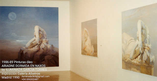 Hace más de 30 años (1987-1988) que yo, ILUMINADA GARCIA TORRES (Elche, 1949) realicé dos pinturas al óleo de la escultura de mármol ARIADNE dormida en Naxos, en el Museo del Prado de Madrid, para lo cual el pintor Antonio López García me recomendó en la solicitud del permiso que debía cumplimentar para poder pintar en el MUSEO. Después realicé otras pinturas en mi estudio de la escultura de Ariadna, que mostraría junto a las composiciones pictóricas de objetos geométricos de influencia metafísica y arquitectónica en 1990, en la exposición de la Galería Albatros de Madrid. Miguel Fernández-Cid publicó en Diario 16 la entrevista que me hizo con motivo de esta exposición.